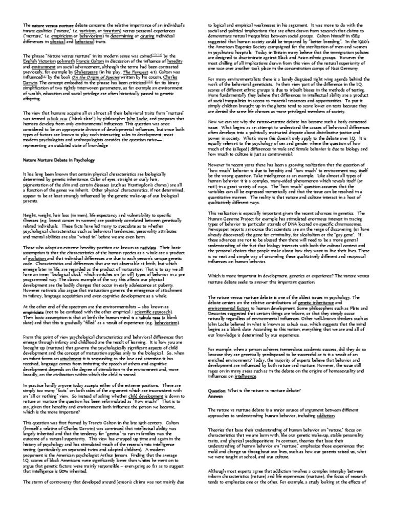 Discuss The Nature Nurture Debate In Psychology Refer To Two